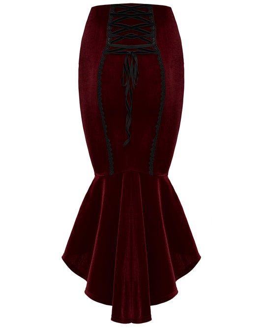WQ-876BQF Womens Baroque Gothic Rose Embroidered Velvet Fishtail Skirt - Red & Black